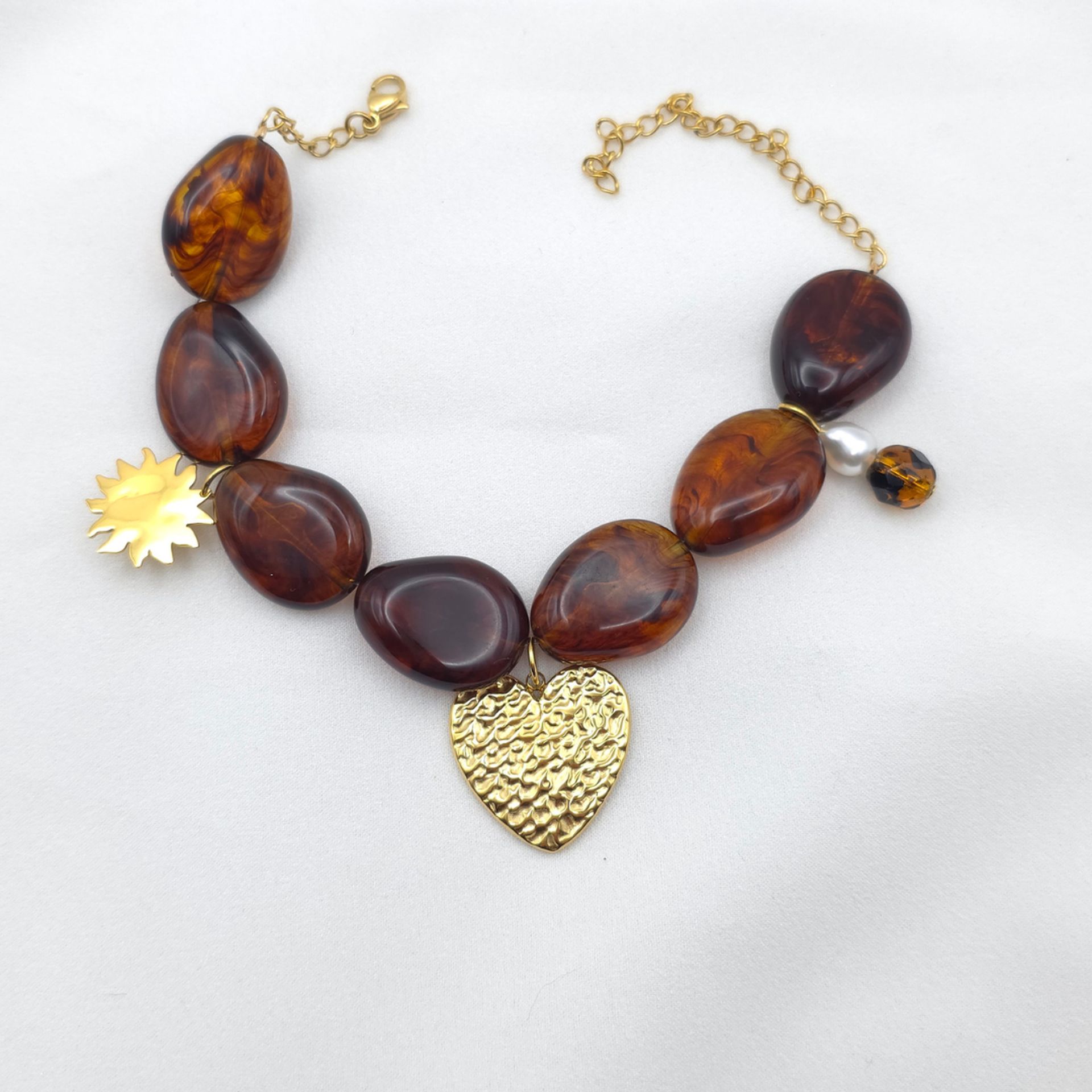 Un cœur doré martelé bat entre des perles caramel : Esmée glisse sur votre poignet comme un rayon d’automne, éclatant, chaleureux, délicieusement bohème.